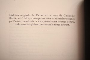 La rédaction de l’ouvrage fut finalisée lors d’une résidence hivernale au Château H. de Saint-Julia, lieu mystérieux et hors du temps niché aux confins de la Montagne noire, ce qui n’enlève rien, au contraire, à la touche gothique de Cette ville vide, livre-voyage, livre-rêve, livre-film posé au cœur d’une troublante multiplicité de mondes.